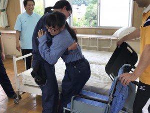 ベッドから車いすへの移乗体験。見た目以上に技術が必要です。